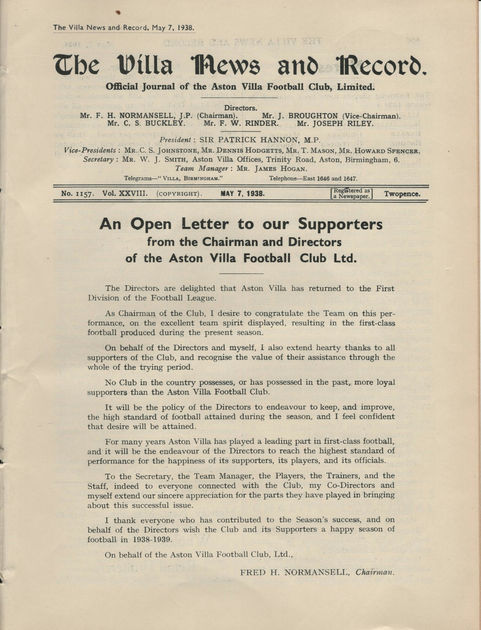 ๐ฉ 7 May 1938, Villa 2-0 Norwich, Villa Park