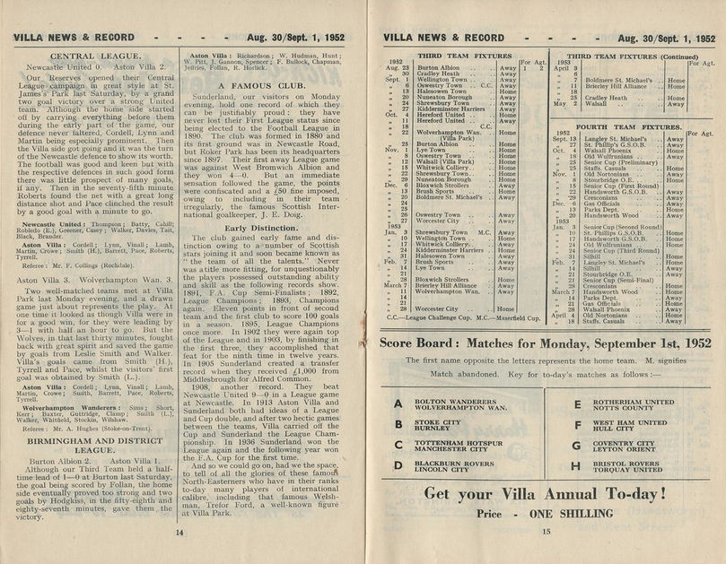 ๐ฉ 1 Sep 1952, Villa 3-0 Sunderland, Villa Park