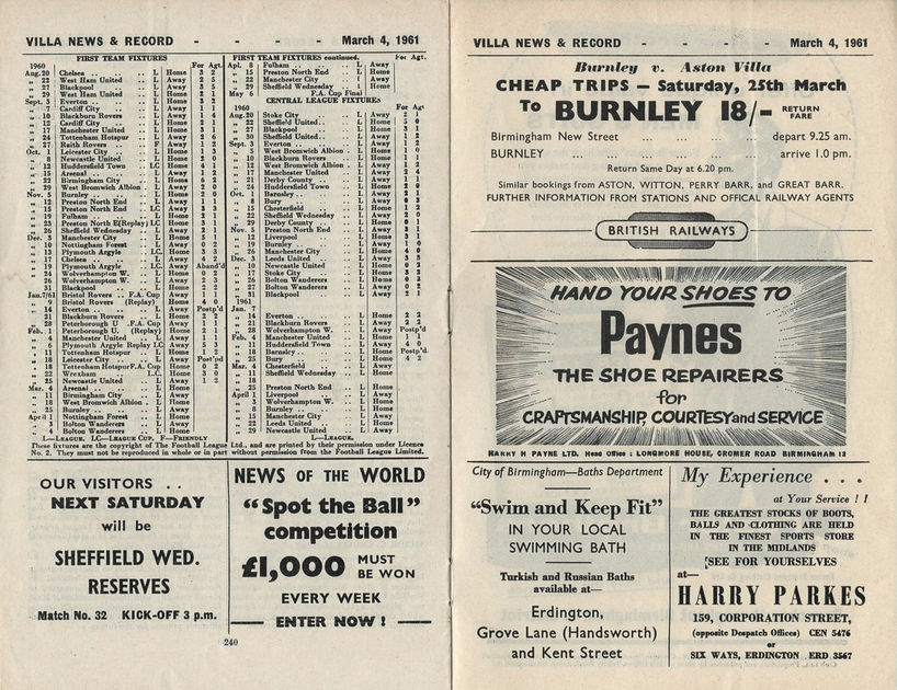 ๐จ 4 Mar 1961, Villa 2-2 Arsenal, Villa Park