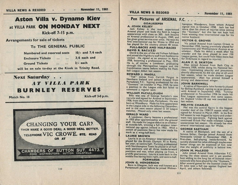 ๐ฉ 11 Nov 1961, Villa 3-1 Arsenal, Villa Park