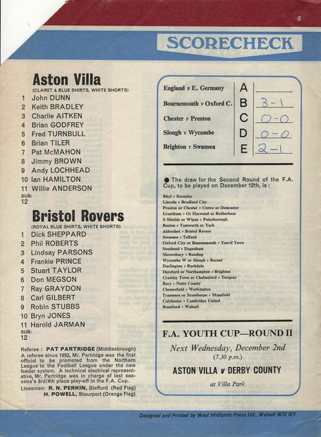๐ฉ 25 Nov 1970, Villa 1-0 Bristol Rovers, Villa Park