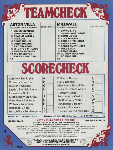 ๐ฉ 21 Sep 1974, Villa 3-0 Millwall, Villa Park