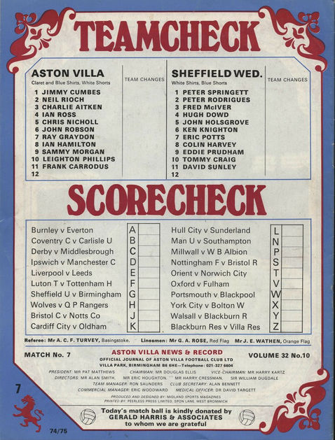 ๐ฉ 26 Oct 1974, Villa 3-1 Wednesday, Villa Park