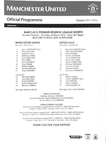 Villa are beaten for the first time in seven Premier Reserve League games after six consecutive wins when they come up against a Manchester United u21 side packed with First Team and Full International ringers. Perfectly within the rules, if not the spirit of the competition.