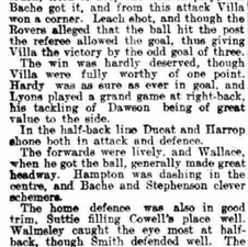 Harold Edgley scores for the third time in as many games as Villa win for the first time in four but the winning goal from Jimmy Leach is the subject of much Blackburn dispute as their players protest the ball had not cross the line, the referee felt otherwise.