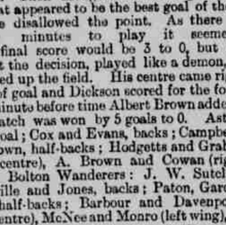 As there remained but four minutes to play it seemed likely that the final score would be 3 to 0, but Hodgetts, annoyed at the decision, played like a demon, and once more dashed up the field. His centre came right across the front of goal and Dickson scored for the fourth time, whilst a minute before time Albert Brown added another, and the match was won by 5 goals to 0.