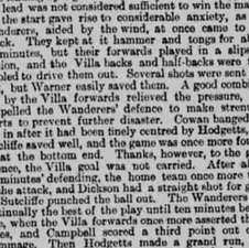 Owing, however, to the clever defence of Jones, Sommerville, and Sutcliffe, twenty minutes elapsed before the Villa scored. Then Campbell placed the ball prettily to Hodgetts, who centred with his usual accuracy, and Brown, being well up, beat Sutcliffe with a grand shot.