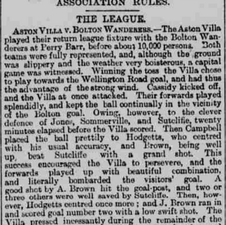 The Aston Villa played their return league fixture with the Bolton Wanderers at Perry Barr, before about 10,000 persons.