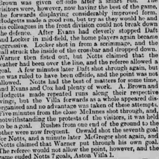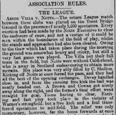 The Villa put their full team in the field, but Notts were without Calderhead, who is away in Scotland endeavouring to obtain more recruits. His place was very ably filled by C. Shelton.