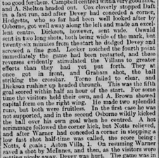Cox cleverly stopped Daft in a fast run, and after Devey had conceded a corner, Hodgetts, who so far had been well looked after by Osborne, got well away along the left and made an excellent centre. Dickson, however, sent it wide.