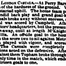 The second half was not worthy of description. With the exception of a run by Topham, who scored, the Casuals gave a miserable exhibition, and were completely and decisively beaten by the home team.
