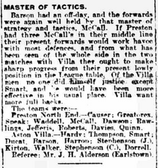 Villa 0-3 behind in 17' lose goalkeeper Sam Hardy and Clem Stephenson for the second half. Midfielder Andy Ducat takes over goalkeeping duties whilst Clem remains on the pitch but unable to contribute.
