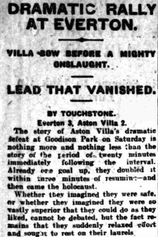 The brawl occurs when Frank Barson cannot check his run collides with Irvine after his second goal and the Everton forward reacts with indiscriminate violence attacking Barson and peacemakers alike. Everton's Crossley and Fazackerley also joined in the fight yet referee Kirby remained totally oblivious and took no action.