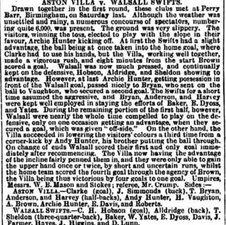 Soon after Clarke ran out and kicked the leather away in the nick of time, and then the Swifts were pressed for a time, the Villa forwards swarming around their goal; but excellent defence by Aldridge, Sheldon and Yates proved effectual and the Villa goal was in turn hotly assailed, a protracted scrimmage occurring in the goal mouth, Clarke being down, and a goal for the visitors seemed certain, but the Villa got the ball away, and then good work by Brown and Archie threatened the Swifts position, while afterwards Roberts had led the ball very cleverly to Davis, that player sent it over the bar.