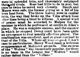Whilst the forwards compared very badly with those of the Wanderers, the Villa half-backs did not play in their usual dashing manner, Cowan excepted.