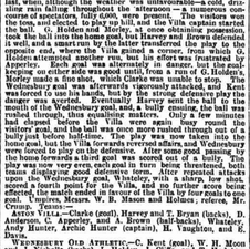 Whateley and Hunter made several unsuccessful shots, but at length G. Holden, who had been very busy, got the better of Apperley and centred to Morley, who shot for goal and Clarke, cleanly missing his kick, the ball rolled through the Villa posts.
