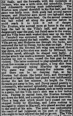 The Everton men played downhill in the first half, and the game was fairly even. Both goals had several narrow escapes, and Hinchley soon saved two splendid shots which had well-nigh been fatal. On the second occasion the ball rolled all along the goal-line before he could reach it to kick it out of danger. The Everton, who seemed more at home in the mud, kept the ball in the Villa's half, and again got dangerously near the goal, but Baird came to the rescue, and the Villa front rank worked their way up the field. L. Campbell was entrusted with the centre, but he unfortunately placed the ball outside.