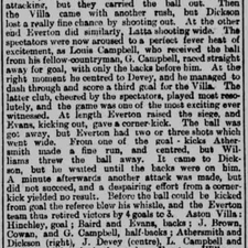 Athersmith was conspicuous for a fine run and shot, but the ball passed over the bar. The other goal was soon attacked, but Everton met with no success. Continuing to press, however, they gained a corner-kick, but it was weakly taken, and the ball then travelled to the other end, where Devey and Dickson tried shots; only a corner-kick resulted, and the next moment the other side were found attacking, but they carried the ball out.