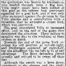 Despite the handicap Villa create danger before Norris exacerbates his injury and Len Capewell is forced to leave the field of play for treatment, during which time Bury open the scoring.
