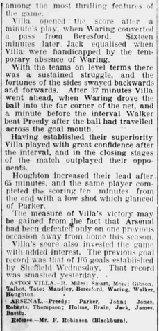 Villa make it twenty wins, eight draws and six defeats in their thirty four division one games having scored ONE HUNDRED AND NINE goals breaking the League record previously set by Sheffield Wednesday.