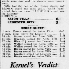 Scorer(s) | George Brown | 6' | 23' | 54' | 82' | 89' | Joe Beresford | 24' | Billy Walker | 33' | 43' |