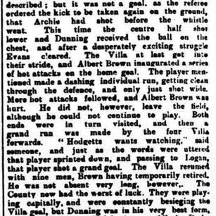 In this game at Derby the Derby team played a new forward named Little, from Kirkcudbright. The Villa had the advantage of the wind at starting, but, for all that the home side had the better of the play for some time.