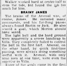 Despite Arsenal losing three players to injury in the first 45' and playing for a period with just eight men they score three as Villa are unable to come to terms with the non-standardised ball being used. The ball, far lighter than the norm, proves impossible for a novice user to control, Arsenal however have no such trouble despite their player deficit.