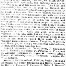 In the first half of the game the Villa had considerably the best of play, and at half time the score stood one nothing in their favour; but on change of ends the superior combination of the Birmingham team was altogether too much for their opponents, and goal after goal was registered in quick succession.