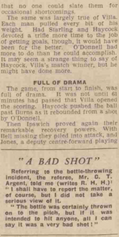 Villa beat division three side Ipswich in the replay of the third round of the FA Cup at the second attempt thanks to a brace from Freddie Haycock but Ipswich disgrace themselves with a bottle thrown at Villa's George Cummings.