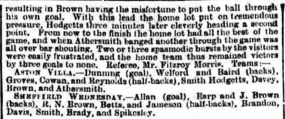 Hodgetts played fairly well, whilst John Devey worked indefatigably from start to finish, and A. Brown was good as inside right. At times he displayed all his former cleverness, and really made some admirable shots in the first half. He is scarcely, however, as useful a player as Hare, who possesses an advantage in size and whose rushes have proved invaluable to the Villa on so many occasions. He was absent from the team through illness, and it is to be hoped that he will be well enough to take part in the contest against Newton Heath at Manchester next Saturday.