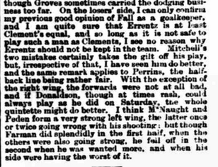 The Villa’s victory at Clayton was a most creditable one. Owing to illness Smith and Hare were unable to play, and the team consequently underwent considerable change. Groves was moved from half-back to the inside position on the left wing, whilst Russell was brought from the reserves to fill Groves’s usual place. It had been originally intended to play Groves on the right with Athersmith, but Smith’s sudden indisposition upset that arrangement, and Albert Brown was called upon to partner the Villa sprinter.