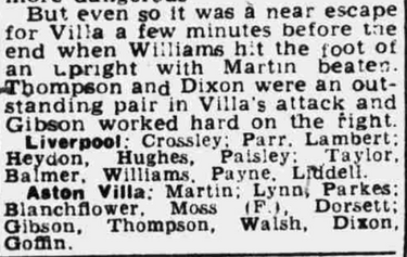 Crossley, Williams, Parr, Lambert, Paisley, Hughes, Payne, Heydon, Taylor, Balmer, Liddell (g).