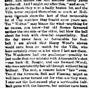 Each team was strongly representative, the Wanderers forward division having been altered owing to the weak attack of late, and the Villa sent their best eleven.