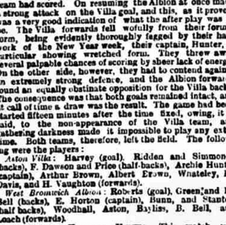 Immediately after the ball had been set in motion the Villa commenced to play a dashing game, and to all appearances they seemed to have profited by their tour. Green and H. Bell for the Albion played a stubborn defensive game, and notwithstanding the strenuous exertions of the home eleven no goals were scored.