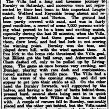This, the first meeting of these teams, was played on the Burnley Ground on Saturday, before 8,000 spectators. The home side, who have transferred their famous custodian, Hillman, to Everton, had Johnstone goal, while the Villains had Burton playing right half-back.