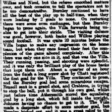 "At length, when only five minutes remained to play, Athersmith put on the equalising goal, and later had hard lines in not scoring again. Result: Villa, three. Burnley, three."
