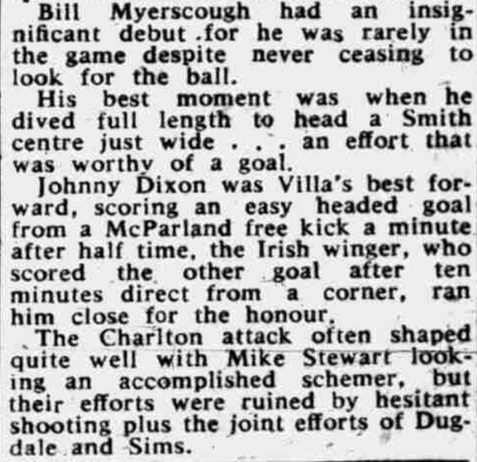 Meanwhile, forward Billy Myerscough made his Villa debut after moving from Walsall in July 1955.