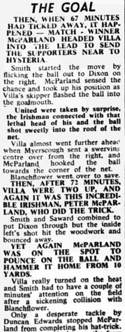 In the 68th minute Peter McParland grabbed his and Villaโs first goal, heading in Captain Johnny Dixonโs fine cross which gave stand in keeper Blanchflower no chance at all.