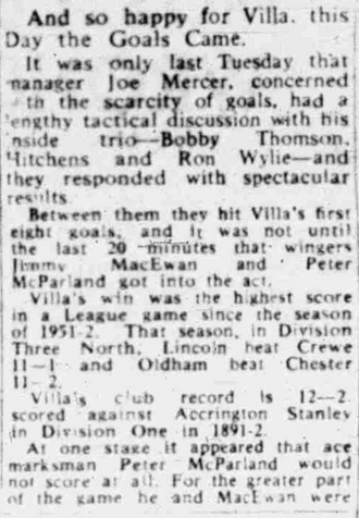 Assist(s) | Bobby Thomson | 2' | 29' | 72' | Vic Crowe | 26' | Stan Lynn | 40' | Nigel Sims | 46' | Peter McParland | 60' | Gerry Hitchens | 63' | Jimmy MacEwan | 65' | Ron Wylie | 69' |