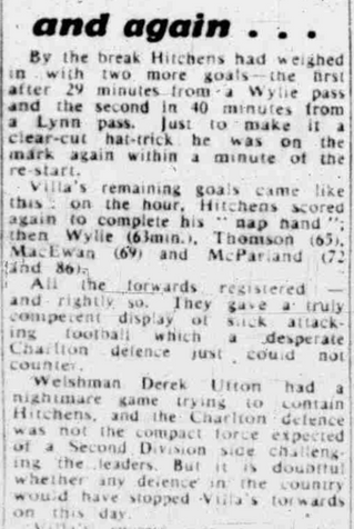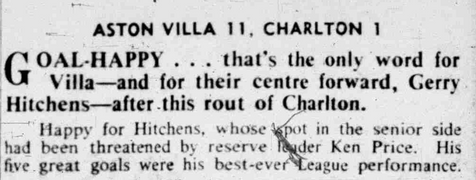 Villa bounce back from their shock defeat at Anfield - their first in 15 games - with an extraordinary performance and result at Villa Park. Villa hit Charlton for 11 goals, Gerry Hitchens scores 5, and Villa record their biggest ever league win.
