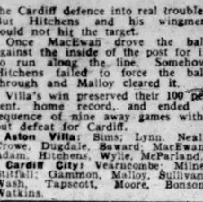 Joe Mercer's Villa bounce back from their shock defeat at Millmoor to beat Cardiff and make it fourteen wins, five draws and three defeats, all away, in twenty two division two games so far this season.
