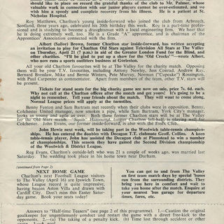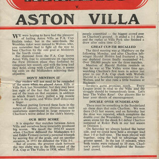 Joe Mercer's Villa, having destroyed Charlton 11-1 earlier in the season surprisingly lose at the Valley for their first League defeat in six and make it twenty two wins, nine draws and six defeats, five away, in thirty seven division two games so far this season. Despite the shock defeat, Villa are still odds on for promotion back to the top flight at the first attempt. Meanwhile, centre forward Brian Handley made his third and final Villa appearance aged 23 before moving on to Torquay United in September 1960.