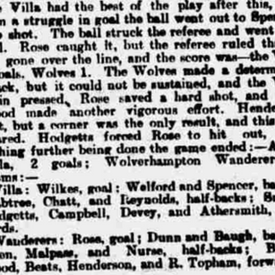 “The Wanderers’ back division was again soon troubled, as the Villa ran down in a determined manner. Rose saved a couple of hot shots, but a minute later the ball glanced off the referee’s leg into the net, and the Villa were placed in front.