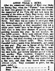 "Desperate efforts were made by Bury to make up lost ground, and homesters had an anxious time in the closing stages, but Wilkes saved time after time, and eventually the game closed—Villa, two goals; Bury. nil."