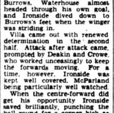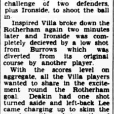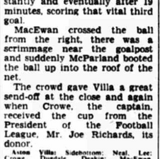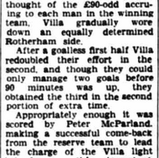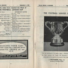 Joe Mercerโs Villa, two goals down from the first leg, are held to a goalless first half before forcing extra time by drawing level by full time from goals from Alan O'Neill and Harry Burrows before Peter McParland hit a 109' winner to win the inaugural League Cup final 3-2 on aggregate.