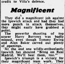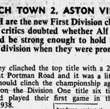 Villa are unluckily beaten once again but Ipswich aren't complaining as their fortunate victory over Joe Mercer's men clinches them their first ever League Championship, just as Tottenham had the previous season.