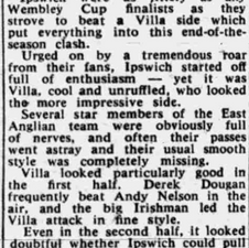 Joe Mercerโs Villa - in fixture congestion typical of the period as the authorities continued to struggle to fit a full League campaign and two Cup competitions in to a regular season - play their fourth game in seven days and are beaten by champions Ipswich - a side Villa had beaten 3-0 in December. As a result, Villa make it eighteen wins, seven draws and sixteen defeats in forty one Division One games this season.