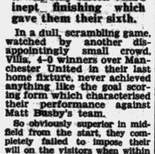 Joe Mercer's Villa fail to score for the second successive match and the seventh time in twelve as they fail to win at home for the seventh time in eleven to make it seven wins, two draws and eleven defeats in twenty League games.