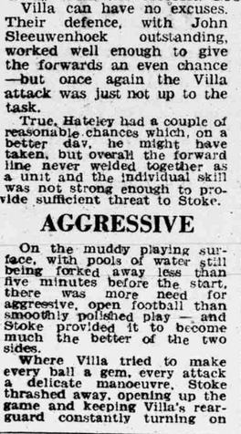 Dick Taylor's wildly inconsistent Villa lose for the tenth time in sixteen games to make it twelve wins, five draws and twenty defeats in thirty seven League matches. Meanwhile, ex Villa man Harry Burrows once again does the damage for Stoke - scoring both goals to beat his old side.
