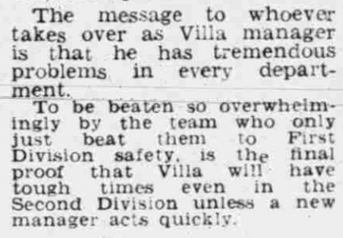 Dick Taylor's relegated Villa end the season with a wretched set of statistics that couldnโt mask the deficiencies of Taylorโs regime and the team on the pitch. One win in the final thirteen games. Four successive defeats to end the season. Twenty five defeats in forty two games Four defeats conceding six. Six defeats conceding five or more. Fittingly ending the season with a final day six goal concession. It was however mid season when the heavy defeats became narrow losses that relegation became an almost certain denouement. The only surprise was that there was one worse team in the division - Blackpool - who took up last place. Unsurprisngly, 1966-67 would be Taylorโs final season in charge as Villa faced up to life in the second tier.